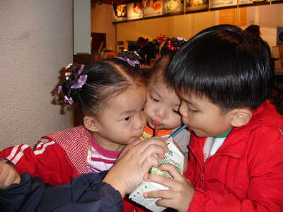 有經驗的媽媽很清楚,小孩子要共喝一瓶,不太可能大家輪流的,這樣一來一個喝,兩個便在旁邊吵。所以最好的做法就是三根吸管,至於誰喝得多或喝得少,就各憑本事了。