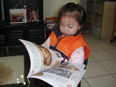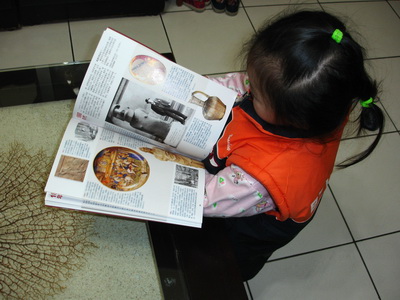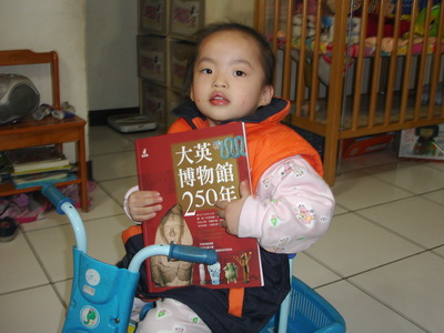看展覽若是走馬看花,就有點可惜,最好能事前先做點功課,於是買了本介紹的書籍來看看。爸爸在客廳看書或看報紙時,有時都會從後面來摀蛋,常常就是把爸爸拿著的報紙拍掉,露出個大臉喊耶。這次也不例外,書又被蓉蓉拍到地上,於是對蓉容說:『書很好看,妳要不要看』沒想到她一拿起來就一直翻,還很認真地看著裡面的圖片。她最感興趣的是裡面一個非洲面具和一付頭盔,大概是這兩張圖比較大張吧。而小潔有興趣的是一個國王雕像,這是這次大受歡迎的展品,就是哈利波特裡的西洋棋,可是小潔又沒有看過哈利波特呀。