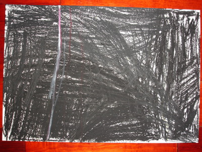 那是因為他想用白色、黃色的淺色來畫畫,但沒有黑色的紙,所以自己先拿一張紙,把它塗得黑黑的。不過因為是臘筆,所以很難在上面再塗上淺色的臘筆了。