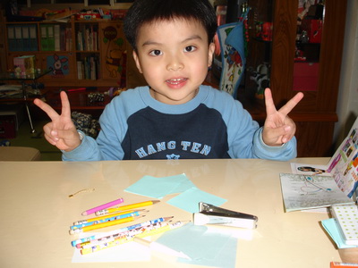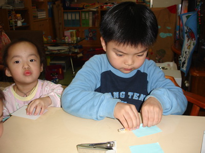 取出紙捲,將一端折起來,用釘書機釘住。至於要不要用之前買的彩色釘書針,似乎一點都不重要。