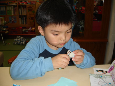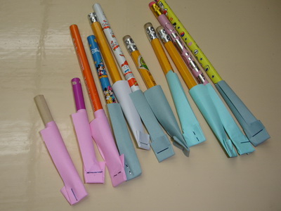 有次在外面恰好碰到孩子們要畫畫,於是爸爸從包包裡拿出幾支鉛筆,寶寶發現爸爸的鉛筆,有個紙套子保護筆芯,回家後,就說要自己做鉛筆蓋,材料很簡單,普通的便條紙就行,如果要有漂亮的顏色,就用色紙,裁成小張、方形的紙片即可。