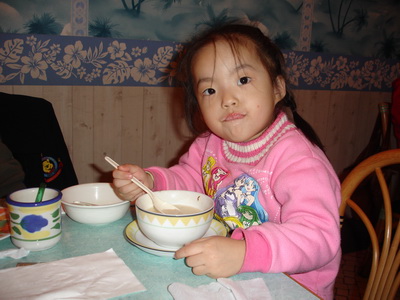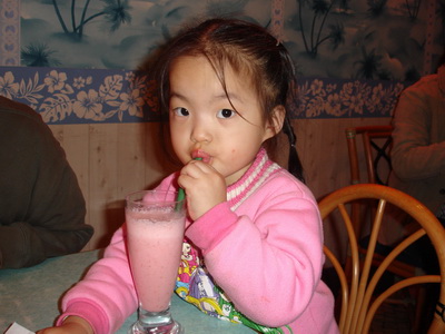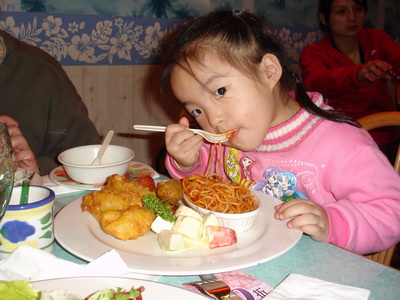 先前每次外出吃飯時,考慮三個小孩子吃的份量有限,所以都是點一份讓小朋友分著吃,如果可能的話,就儘量點兒童餐,不過也大約只點兩份。由於大多數的兒童餐,都會有較吸引小朋友的餐具,或是會有擺飾得可愛有趣的菜色,所以之後漸漸地發現到,當服務員送餐時,一份送給寶寶,一份送給蓉蓉,而小潔也就眼巴巴地看著、等著、盼著,但就是輪不到自己的一份。將飯麵配菜等舀一碗給小潔,她也會注意到怎麼自己用的碗很普通,和哥哥及蓉蓉的不一樣。這時偶而會伸手指比來比去,偶而會臉氣氣的不情願,偶而會噘著小嘴嘟嚷嘟嚷不停。嚴格來說,小潔應該不是最近才注意到,而是大人到現在才漸漸聽得懂她要表達的抗議。
