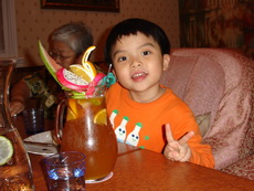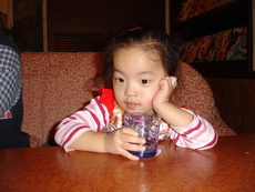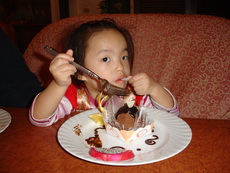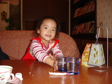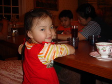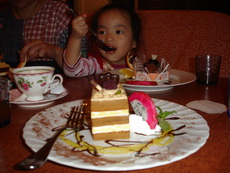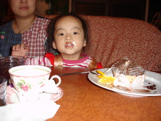 座椅是沙發式的,每一桌都是兩張二人座,所以我們四大三小,就併了兩張座位,似乎太寬鬆了。餐點有點特殊,是中式的飯和菜,味道還不錯,就是份量少了些,而副餐卻是西式的蛋糕和咖啡。
