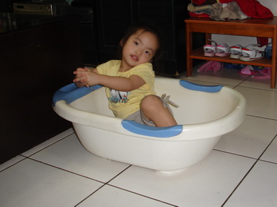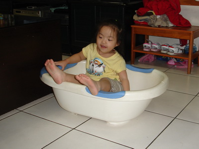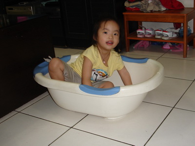 小潔突然在阿婆家找到這個小浴盆,把它搬到客廳玩。這是從寶寶嬰兒時期就開始用的浴盆,又經歷了蓉蓉和小潔,歷史也算悠久了。雖然早就不再使用,但一直還留著,因為材質蠻不錯的,丟掉也可惜。