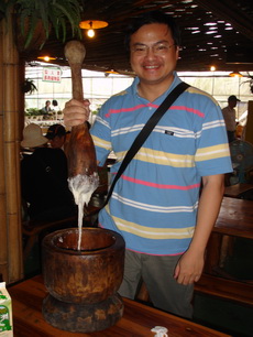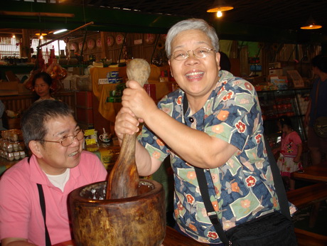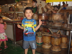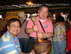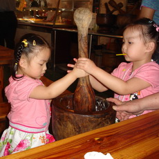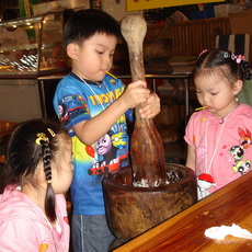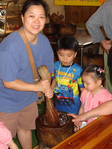 媽媽買了一份麻糬來搗,這種活動已經很熟悉了,連蓉蓉和小潔也是一拿到臼杵,就直接搗起來了。