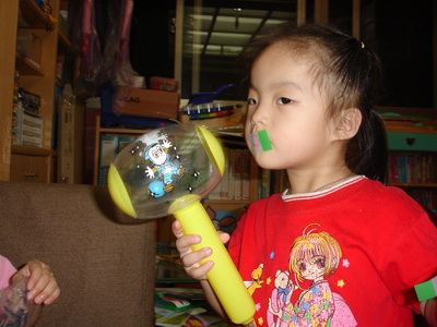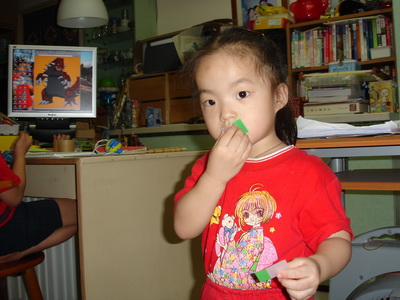 小潔在爸爸桌上發現一盒3M的自黏標籤紙,她對這個很好奇,發現它可以很容易黏起來,又很容易可以撕開,實在非常好玩。她還找到一種新的玩法,就是把它貼在嘴巴上,可是大概覺得黏不牢,所以還要用鎚子鎚一鎚才行。