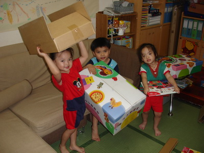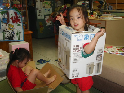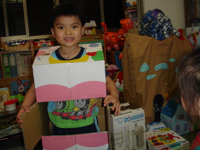 郵購的書寄來,用了好大的紙箱裝著,紙箱的印刷又很可愛,於是寶寶便想要用紙箱做機器人 (前一次玩這個遊戲已經是兩年前了,不知道寶寶自己是否還記得?)