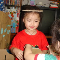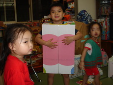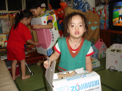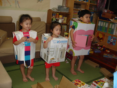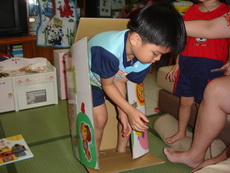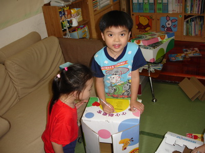 很快地,完成了小潔的機器人紙箱,在一旁的蓉蓉也說要做一個,可是她已經把剩下來的紙箱給壓扁坐壞,沒有紙箱了…