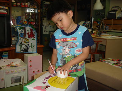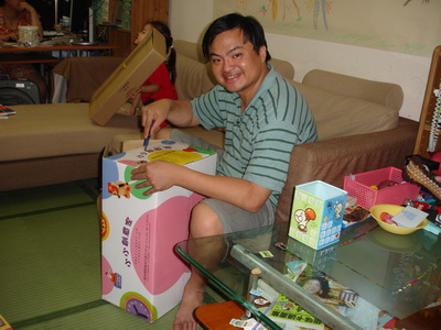 接著用美工刀把洞割開,這個工作就由爸爸來進行。這時寶寶把相機拿起來,幫爸爸照相,還照得挺不錯的哩。