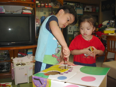 小潔看哥哥玩得很有趣,於是她拿一個紙箱來找爸爸,也要做一個。