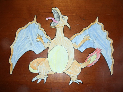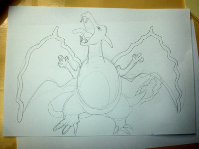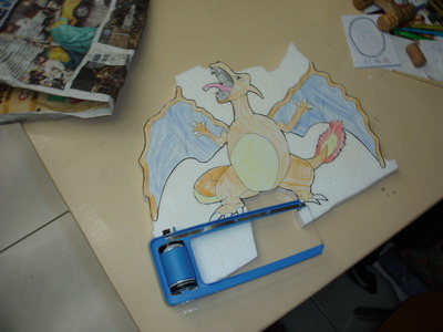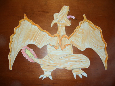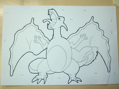 因為要把噴火龍剪下來,所以把外框以較粗的筆描繪出來。同時再取一張圖畫紙,將兩張紙疊起來,周圍用釘書機釘起來,目的是要剪下兩張相同的噴火龍,另一張要畫背面。