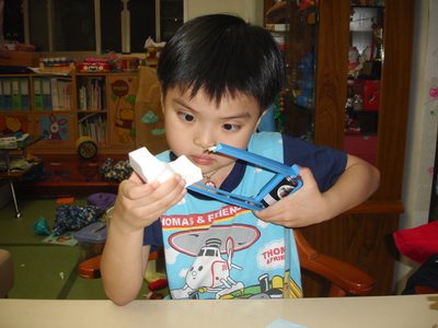 保麗龍是他沒用過的材質,所以很興奮地說好,至此終於確定噴火龍的製作方式。在家裡找不到夠大的保麗龍,到社區的資源回收區找,偏偏才剛把所有的資源垃圾給清光,於是,只好到文具店買張新的保麗龍。保麗龍切割器是寶寶第一次使用,所以先找塊不要的練習一番,這才開始動手切噴火龍。