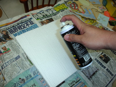先使用噴霧式膠水,在保麗龍板上噴上薄薄而均勻的一層膠…(這個要爸爸動手,但也突然覺得寶寶這個年紀,使用的工具都太專業了些)