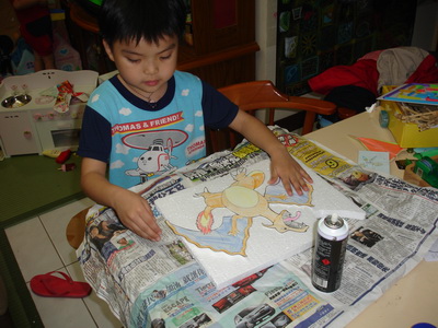 使用保麗龍切割器來裁切噴火龍,本來這部份是讓他自己裁,但寶寶切了一會,不是很熟,偶而壓著開關的手會酸而鬆掉,就切不下去;另外,也由於太喜歡這隻噴火龍了,他怕切壞,所以後來都要爸爸幫他割了。