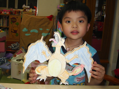 從沒看過噴火龍背部的圖案,於是拿出寶寶的模型玩具,簡單畫了一下噴火龍的背部。同樣地,背部也由寶寶負責上色。