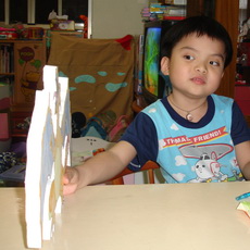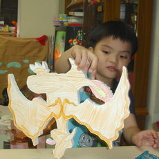 原本寶寶的設計,是想用厚紙板貼起來。找卡紙讓他看,他說不是;拿瓦楞紙來,也說太薄,這下可難倒爸爸了,是哪種厚紙板能夠厚到寶寶預期的呢?本想以紙盒來墊出噴火龍的厚度,但覺得這種不規則形狀很難處理,而且若只貼中間部位,整個噴火龍的周圍也很容易損壞。在幾經考量之下,建議寶寶使用保麗龍。