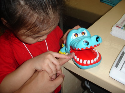放眼一看,整排的鱷魚牙怎麼只剩一顆呀。順手一按,故意按到旁邊,蓉蓉便在一旁猛喊『沒按到,不對,不對啦』;跟她說不敢按,她則又不肯善罷甘休地叫『換你了,快按,快按呀』;往往都在拗不過的情形下,就按了那唯一還立著的牙,『哇~哇~哇~好痛好痛』爸爸無奈地發出痛苦哀號的聲音,蓉蓉則樂得手舞足蹈:『好棒,再玩一次。』