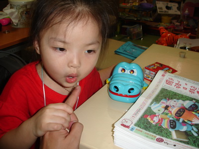 幾天之間玩了幾種新花樣,今天再度拿來找爸爸玩,爸爸用盡各種方法閃躲避開 (按旁邊、壓舌頭、按到頭、縮手彎指、指頭硬掉、彈開鱷魚…),蓉蓉最後則是說『來,我幫你』,然後就拉著爸爸的手指要去按鱷魚牙齒。爸爸看到她的指頭就疊在爸爸的手指上方,那就一起來按吧…