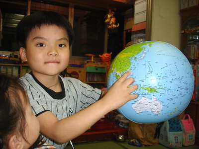 幾乎拿起地球儀的第一件事,就是找看看自己的國家在哪裡,寶寶說他知道,便拿過去轉了轉、東看看、西看看,然後就很清楚地指到了正確的位置,還蠻厲害的呢,學校的老師有教,看來他也有認真學。