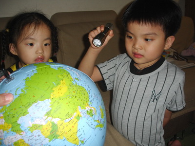 接著爸爸要他拿手電筒來,想來一場科學實驗的教育,可是一聽到可以拿手電筒來玩,蓉蓉和小潔也將她們的手電筒拿來(他們每人都有一支手電筒)。把燈關掉,讓地球傾斜個23.5度,講了一會兒自轉、公轉,解釋了一下晝短夜長,連南極北極的永晝永夜也提了一下。但是一來手電筒的燈光太弱,二來一共有三個太陽搶著照來照去,場面實在太亂。