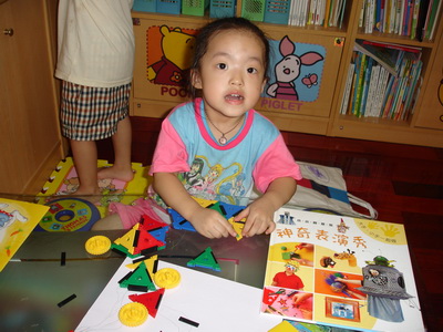 小潔對於這種組合式的積木興趣很高,這是寶寶之前從學校帶回家的禮物,雖然只有十多片,但小潔經常會去把它拿出來玩。由於組合式的積木都是零零散散一小塊一小塊的,所以她都很有耐心地一一把它們接合在一起。目前排出來的還沒有特別的形狀或花樣,不過看她對於組合積木的喜好,似乎該多買一些類似的積木讓她去玩玩。