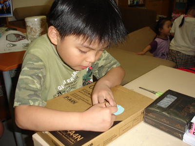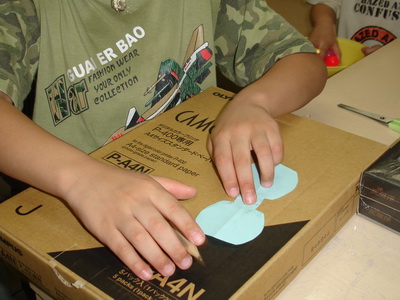 在厚紙板上描繪出外圍的形狀,但接下來的切割部份就不行了,於是要爸爸幫忙切出眼鏡的形狀。