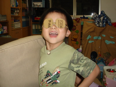 連同掛在耳朵的部份一體成型切割好,寶寶就很高興地戴上了。問他要不要中間挖個洞,他說不要,這樣就是眼鏡了。
