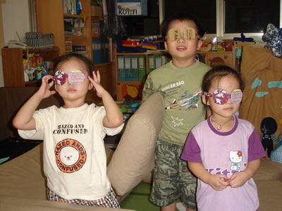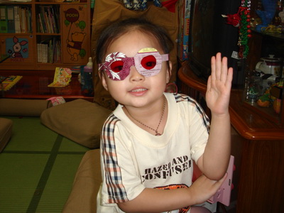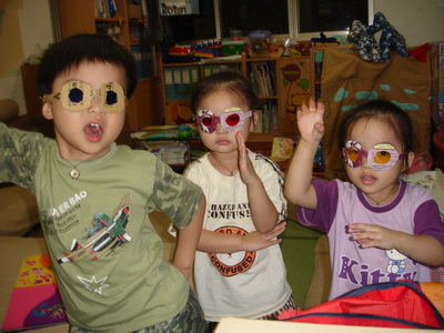 蓉蓉和小潔覺得好玩,也來要求要一幅眼鏡,於是如法炮製同樣的眼鏡,大家就一起戴著玩了。但是這哪是眼鏡,根本只能稱做是『眼罩』,一個人戴也就算了,三個人都戴著,肯定是撞來撞去,於是決定加工把中間挖掉。