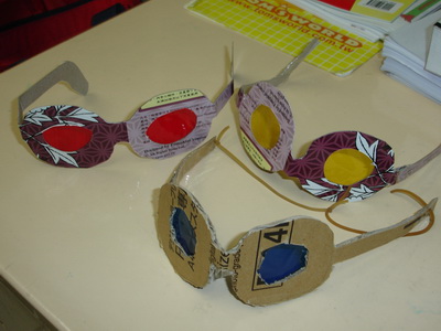 挖洞後的鏡框,還貼上有顏色的玻璃紙,就變成太陽眼鏡。