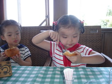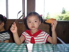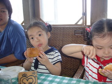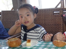 爸爸在候餐時小盹片刻,醒來時菜已上桌,餐點價位偏高,但也還有特色,用貝殼裝著的沙拉很快吃完,海鮮湯則是裝在挖空的麵包裡,蓉蓉不僅完裡面的湯,也刮著留有湯味的麵包,最後,還把整個『碗』給吃完了。