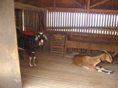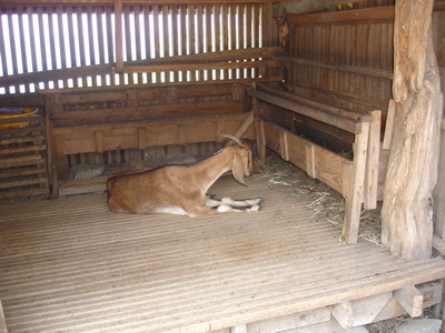羊棚裡一隻懶洋洋坐著休息的羊。