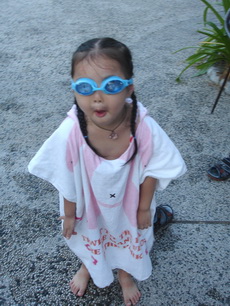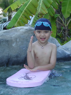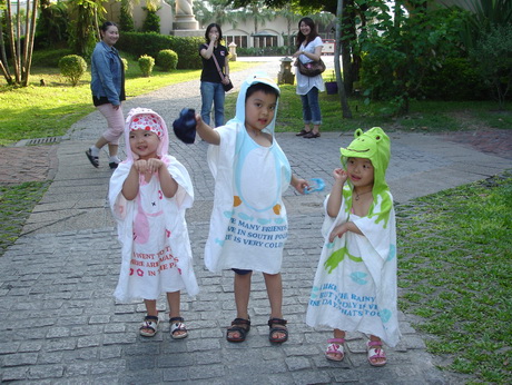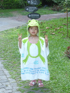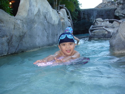 第二天從海洋公園回飯店後,馬上要做的便是去游泳,我們在房間讓三寶把泳衣換好,還穿上媽媽先前特別找到的大毛巾,就這樣走到泳池邊,果然,一路上吸引了遊客的眼光,實在是太可愛了。