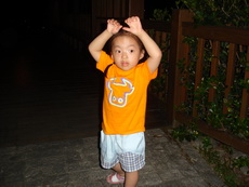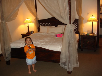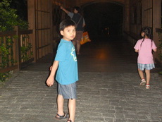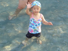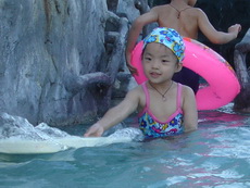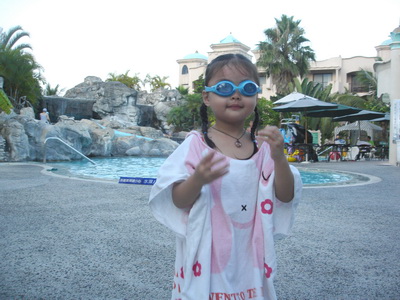 游完泳後,直接到餐廳吃晚餐。由於晚天選了西式的自助餐,今天則改成中式的和菜。我們的餐卷是大人加寶寶共五份,蓉蓉和小潔未到一百公分,所以住宿不用錢,居然連和菜也只肯給我們五人份,結果當然吃不飽,菜色也不佳,這是在這裡讓我們最不滿意的地方。隔天在馬路上看到餐廳大廚在外面走,就覺得,他怎麼敢這樣走在路上,難道不怕被人『蓋布袋』。