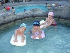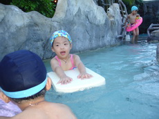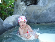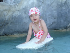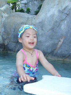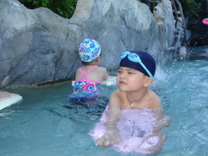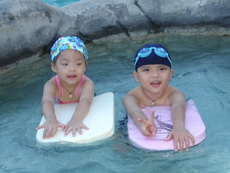游泳池的深度130公分,他們又還不會游泳,阿公和阿婆臨時忘了帶泳衣,而爸爸和媽媽要一次帶著三個下水也沒辦法,在無計可施時,恰好看到在泳池上方有一處飛瀑泳池,旁邊的一小區深度只有60公分,於是便一個帶著一個拖過游泳池到上面去。
