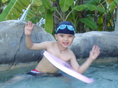 同時跟救生員借了三個浮板,一人一個。寶寶利用浮板,讓身體稍微趴著,偶而腳一離開,就這樣划了出去,這種玩法很適合他,他也覺得是在游泳了。