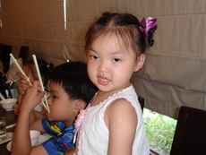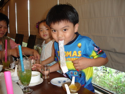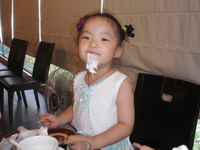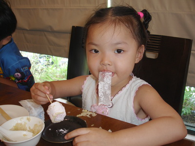 小潔咬出長長的一片麻糬皮,三寶於是比賽誰能把甜點拉得最長。