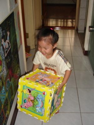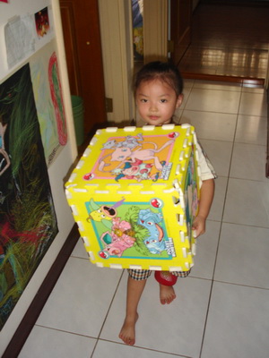 蓉蓉從房裡抬著一個箱子出來,她說是大力士,還堅持要爸爸照一張相。這個箱子是用六片地墊,拼出一個立方體的箱子,但它不是地墊用途,而是因為上面有神奇寶貝的圖案,所以是寶寶指名要買來玩的。