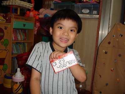 開車等紅燈時,常會碰到有人在發廣告宣傳品。爸爸看到是一張停車時可以放在車上標示電話的牌子,於是要了三張,拿回家給三寶玩。寶寶懂得各個數字的表示法,把每個數字依照順序都刮出來了。