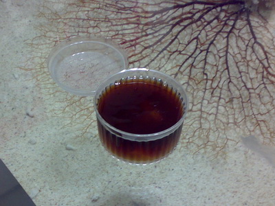 隔天,寶寶自安親班下課回阿婆家,還準備了要給爸爸的禮物。這是在安親班時,小朋友自己動手做的點心,寶寶也把它送給了爸爸。嗯,做得很不錯,軟硬適中,表面也沒有泡泡。還沒吃進嘴裡,光聞味道,好甜,是黑糖口味,裡頭還有綜合水果。爸爸邊吃著,寶寶、蓉蓉和小潔也擠在旁邊,大家一同分享,很快地就吃完了。