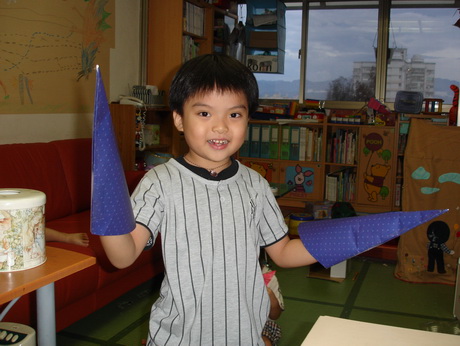 寶寶用大張的彩色紙,沿著對角線對折又對折,他又用膠帶把邊邊互相黏起來,就這樣成了一個玩具,寶寶稱它為『鯊魚刀』。