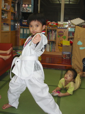 小學裡有許多社團可以參加,其實也就是利用每天早上的時間,學個才藝,寶寶選擇了跆拳道。
