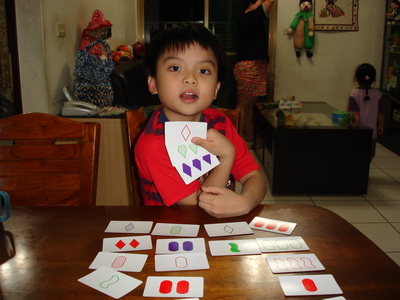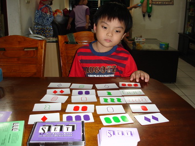 寶寶看到爸爸一個人在玩,也湊過來看看,簡單教了他一下,沒想到他還居然有興趣就坐下來找牌了。剛開始對於規則並不是很了解,但他都很快地說『有了』,然後挑出了三張牌來。起初的牌有一些錯誤,例如兩張是紅色而一張是綠色,這就不符合規則了,利用這個錯誤的範例向他再解釋一下,蠻快就懂了。試了幾次後,果然很順利地找到一組SET了。依爸爸的經驗,初學者要能夠在短時間找到SET並不容易,看來寶寶的邏輯思考、空間感及直覺的反應能力還不錯。