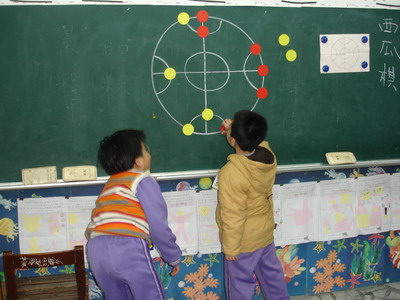 把棋盤貼在黑板上,會玩三子棋的小朋友又舉手了『這就是剛才講的三子棋呀』。其實並不是呀,為了避免他弄混,特別簡單解釋了一下西瓜棋和三子棋的不同之處─西瓜棋是圓的,三子棋是正方形的,很不一樣。