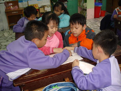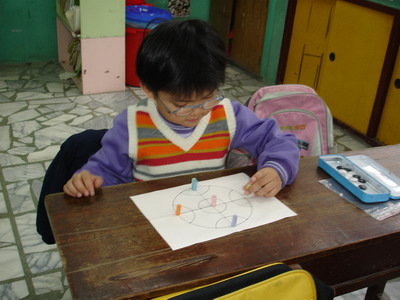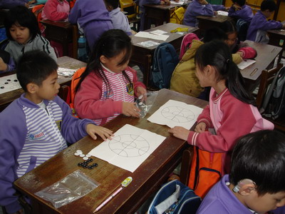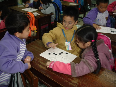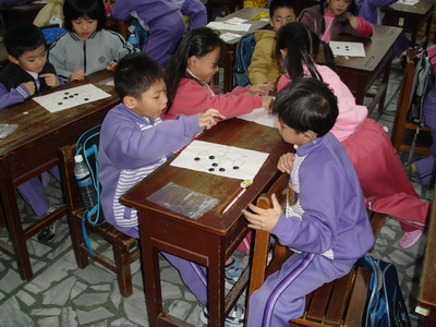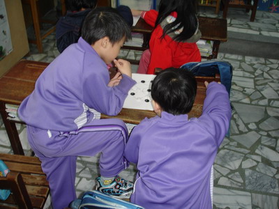 逐一點名舉手的小朋友,答『圍棋』的人最多,約有七、八位,數量不少,可能是這一、兩年有學習圍棋的熱潮,所以不少幼兒圍棋班開設。至於熱潮不知是因為周俊勳在海外成名帶動,還是漫畫及卡通棋靈王大受歡迎的影響。還有些人回答『跳棋』,嗯,一年級的小朋友有玩過也很合理。接著有位小朋友回答『象棋』,然後緊接著幾位都回答象棋,說實在的,爸爸實在很懷疑小朋友會玩象棋,不過想想,有可能是玩過『象棋棋子』,也就將就著算有吧。