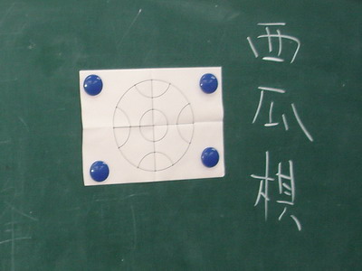 在黑板寫上西瓜棋,開始講解內容,為什麼叫西瓜棋呢?大概就是看棋盤的樣子像個西瓜,所以就這樣命名了 (真的是這樣嗎?) 而西瓜棋是誰發明的?據說是種西瓜的農夫 (這可是從 Yahoo 知識查到,是有依據的,