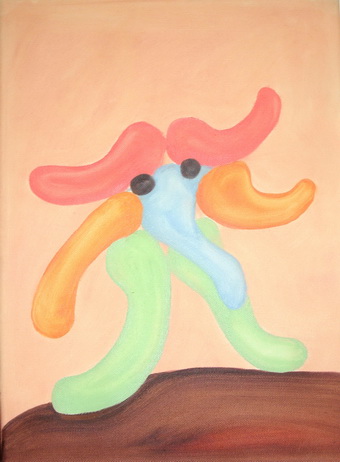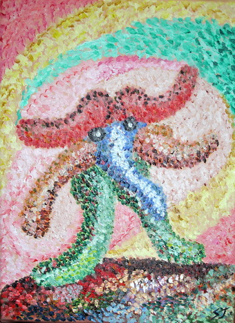 本質上來說,並不符合 Lucy 所要求的細緻點描法。而畫的內容呢,造型還OK,但實在是太花了。尤其是前景已經是各種顏色都有,而背景又花不溜丟的,視覺一片混亂。想到上一期有一堂課也是點描法,也是將畫面畫得五顏六色,該不會風格就是如此吧。