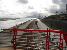 從餐廳望去一條條的平行線,低矮的雲層下只在遠方露出一點天空藍,連接著海平面,到近處則是長長一道防波堤,堤內水道有船通過,更近處碼頭岸、幾道鐵路、人行步道偶有行人通過,最前方則是車道,幾種交通工具的車道並行,還蠻有趣的。