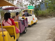 車子一開動,轉彎走到一段上坡,立刻熄火,最後靠著老闆及幾位熱心的遊客下車推才得以繼續前行,而下車推的遊客欲罷不能,順便幫其他騎自行車的遊客推上坡,最後快來不及了又在後拼命追趕上車,算是為渡假村免費提供了娛興節目。