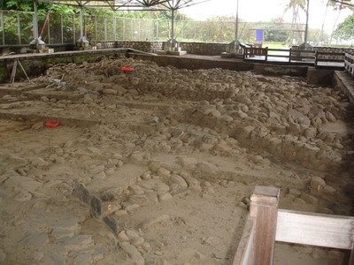 在整個卑南遺跡中,這裡只是小小的一處考古點。大致可以看到這是一個房子基礎,用石頭堆積起來的是外牆,屋外的部份挖得差不多,可見到當初的地板,和現在一些庭院景觀用的石板也很相似。但牆壁所包圍的內部則仍是厚厚的土堆,大概就是目前仍在開挖的部份。因此,一些家用的鍋碗瓢盆、玉石飾品等仍會慢慢出土。
