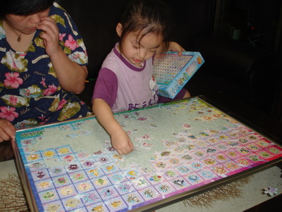 三寶對於小孩子玩的拼圖,早以熟透到失去興趣,一個百來片的拼圖,往往一拼再拼,拼到隨手抓起一片,立刻可以放在紙板的正確位置。所以打算進軍大人的拼圖。寶寶選了個神奇寶貝的拼圖,是五百片裝,而且是較大片的尺寸,買回家後立刻拆封,沒多久就拼完了。